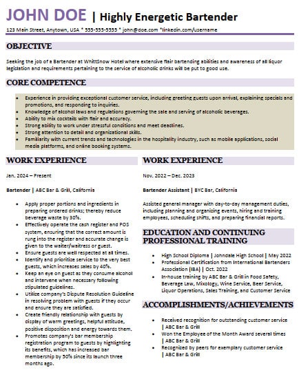 We have covered the different sections you can have in a bartender resume. Now let’s see how they all fit together in making a complete resume: