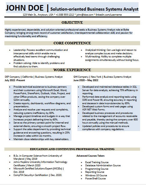 Here is a sample resume for a business system analyst position by putting together the various sections discussed above: